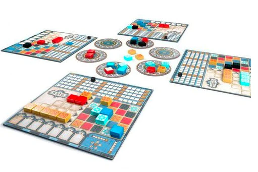 In the game Azul, players take turns drafting colored tiles from suppliers to their player board. Later in the round, players score points based on how they’ve placed their tiles to decorate the palace. Extra points are scored for specific patterns and completing sets; wasted supplies harm the player’s score. The player with the most points at the end of the game wins.