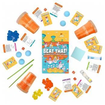 Beat That! consists of 10 rounds of challenges. Start by dealing 10 betting tokens to each player (tokens have different point values). Next, pick up a challenge card and read it aloud. All players then place a bet on their own ability to complete the challenge. Once bets are placed, go around the circle attempting the challenge. Players who succeed bank their points. The player with the most points at the end of 10 rounds is the champion!