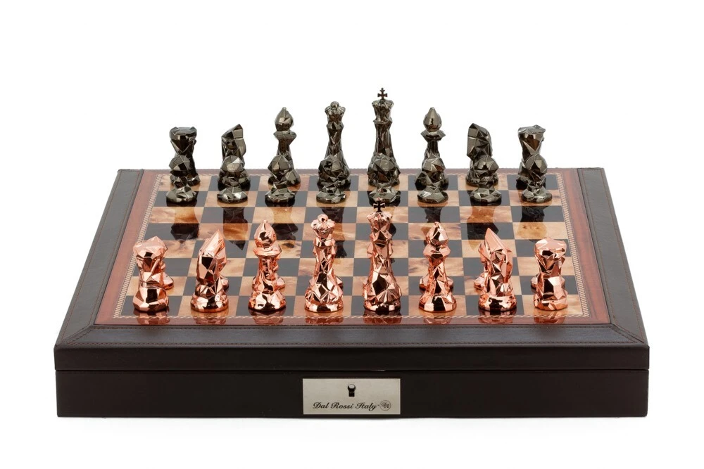 Dal Rossi Italy Brown PU Leather Bevelled Edge chess box with compartments 18″ with Diamond-Cut Copper & Bronze Finish Chessmen