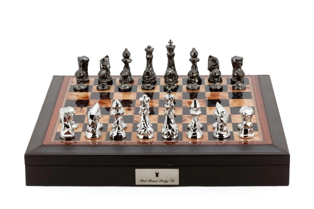 Dal Rossi Italy Brown PU Leather Bevelled Edge chess box with compartments 18″ with Diamond-Cut Titanium & Silver Finish Chessmen