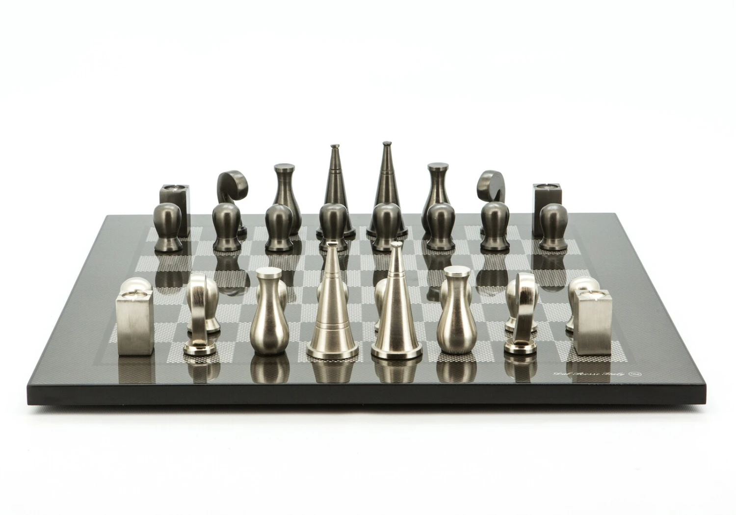Dal Rossi Italy Chess Set Carbon Fibre Finish Flat Board 50cm, With Metal Dark Titanium and Silver 90mm Chessmen