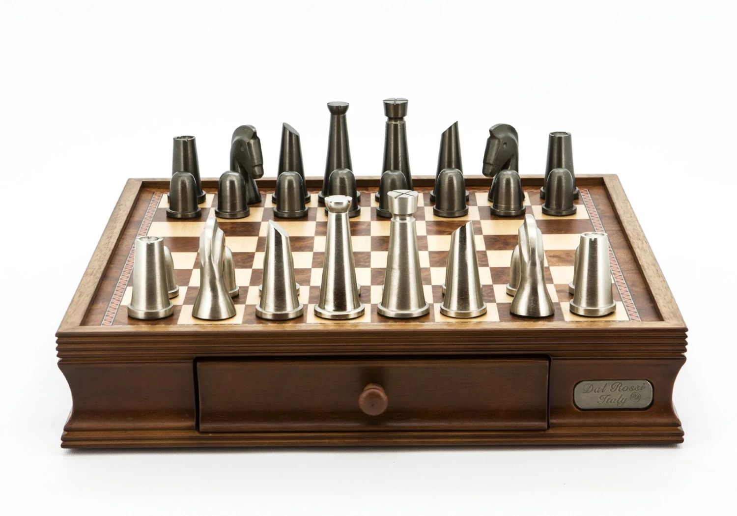 Dal Rossi Italy Chess Set Walnut Finish 16″ With Two Drawers, With Metal Dark Titanium and Silver chessmen 85mm