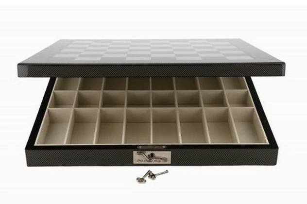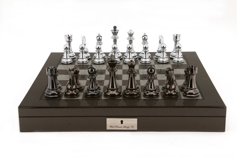 Dal Rossi Italy Silver/Titanium Chess Set on Carbon Fibre Shiny Finish Chess Box 20” with compartments