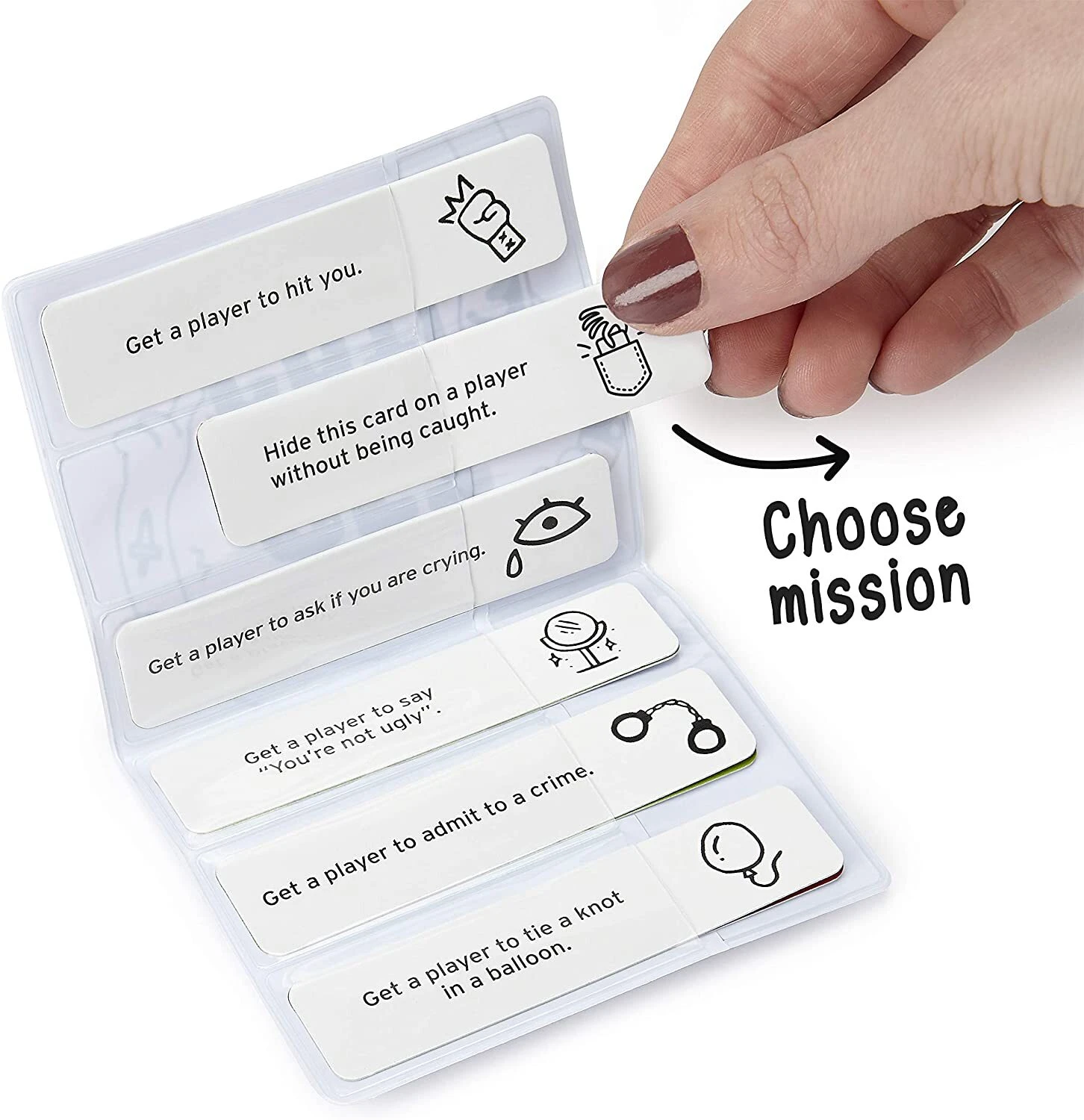 On each card is a mission – one that requires you to trick one of the other players in some way. For example: “Hide this card inside a jar and get a player to open it”. If a player’s feeling suspicious and accuses you, you must come clean and remove that mission from your wallet.