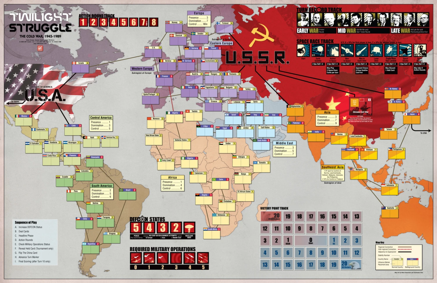 Twilight Struggle is a two-player game simulating the forty-fiveyear dance of intrigue, prestige, and occasional flares of warfare between the Soviet Union and the United States. The entire world is the stage on which these two titans fight to make the world safe for their own ideologies and ways of life. The game begins amidst the ruins of Europe as the two new “superpowers” scramble over the wreckage of the Second World War, and ends in 1989, when only the United States remained standing.
