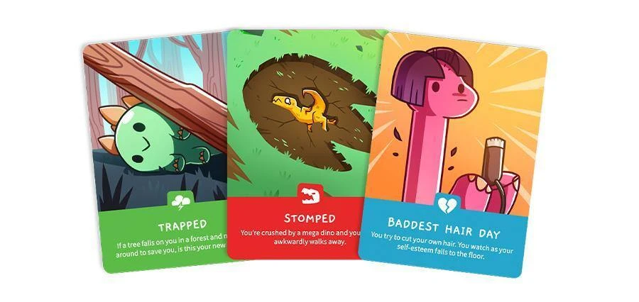 You will work to avoid all of life’s little disasters and laugh as they happen to your friends. If you collect 3 Disaster cards of the same type OR 3 different types of Disaster cards, you will be out of the game. Point cards feature weapons, trinkets, and good luck charms that you use to collect points and avoid disasters. Each card has a point value between 0 and 9 that you will use when scoring a round. You can use Instant cards at different points during the game to tip the odds in your favor or save your Dinosaur from certain death.