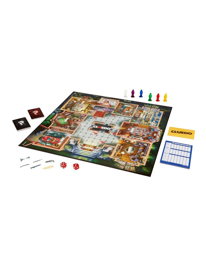 Reclusive millionaire Samuel Black’s been murdered in his mansion! Now, it’s up to you to crack the case! Question everything to unravel the mystery. Who did it? Where? And with what weapon? Ransack the mansion for clues, ask cunning detective questions and leave no card unturned. Solve the murder first to win! Fun twist on the classic mystery game features new characters and a two-player version! Includes Mansion Gameboard, 1 Yellow Murder Envelope, 1 Detective Notepad, 6 Character tokens, 21 Black CLUEDO cards, 13 Red Bonus cards, 6 Weapon tokens, 2 Dice and Game Guide.