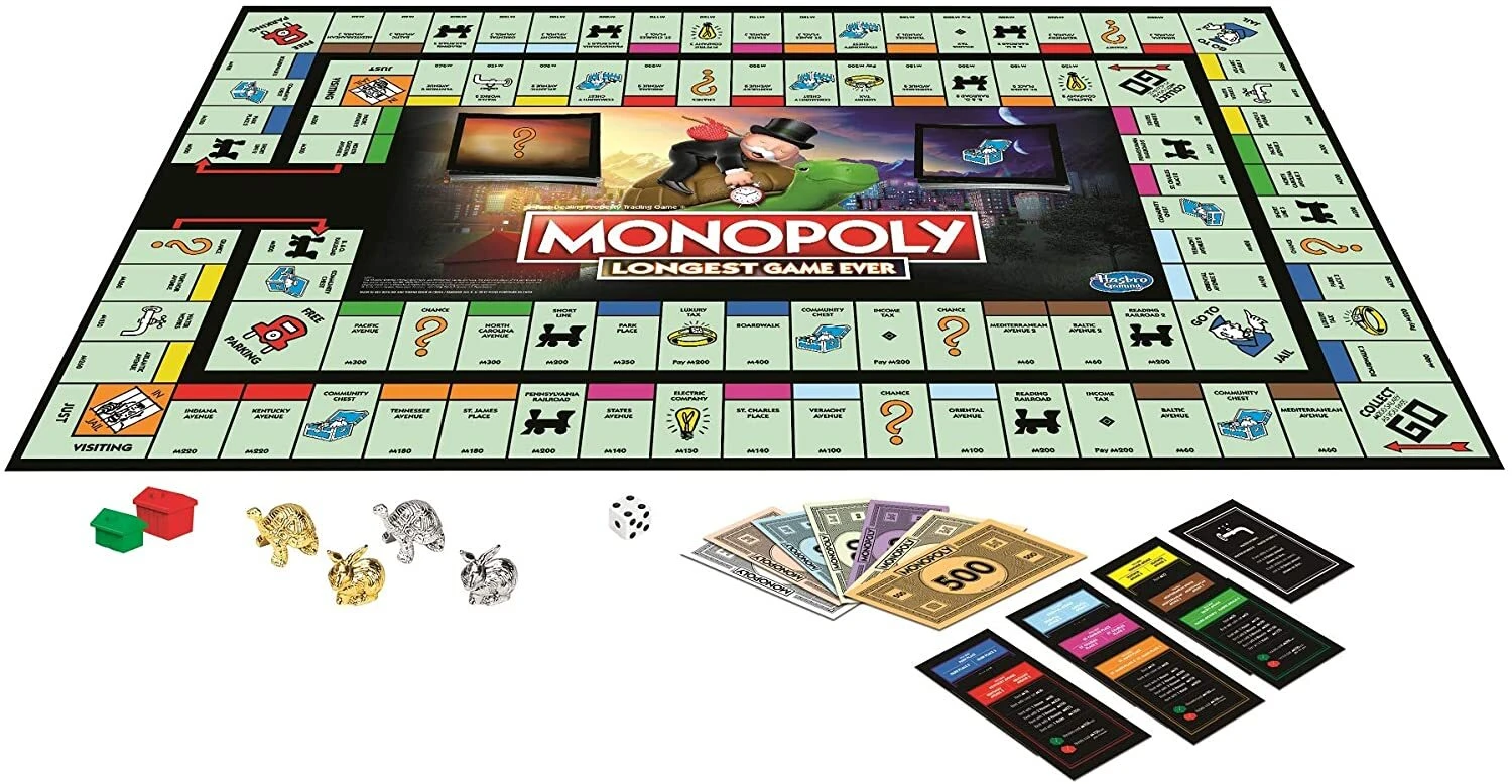 EXTRA LONG GAMEBOARD: Believe us when we say it’s long. It has 66 properties. And there is only one die; no more doubles. So sit back and get ready for a long time to get around the board