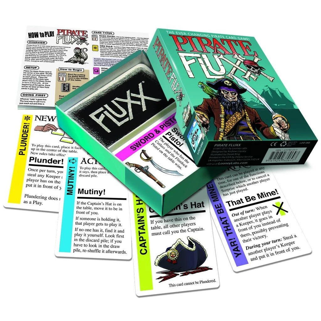 Yarr! Grab yer Cutlass! Pirates have taken over Fluxx, the ever-changing card game, and their rules be new and strange. There’ll be times ye must Talk Like A Pirate, and rules about how ye can Plunder from yer mates. But the most excitin’ treasure fer Fluxx fans new and old is the Surprise! – a new card type that you play out of turn! Your trusty Monkey can watch over the Gold Doubloons while you commandeer Ships on the high seas, but only Fruit can protect you from Scurvy. You’ll enjoy the privileges of wearing the Captain’s Hat… but watch out for Mutiny amongst the crew!