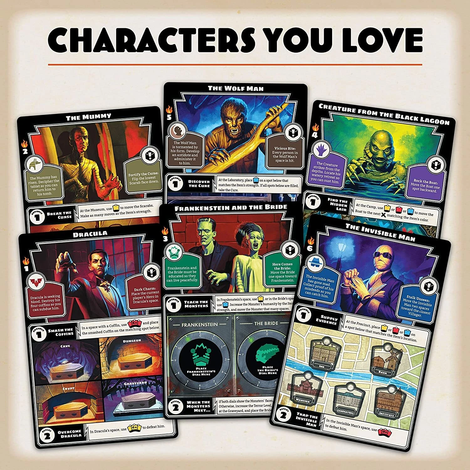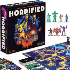 Horrified includes high-quality sculpted miniatures (Frankenstein, The Bride of Frankenstein, The Wolf Man, Dracula, The Mummy, The Invisible Man, Creature from the Black Lagoon). Its innovative, easy-to-learn, cooperative gameplay has players working together against the monsters with varying levels of difficulty. Just as each monster is unique, they require different strategies and tactics to be defeated.