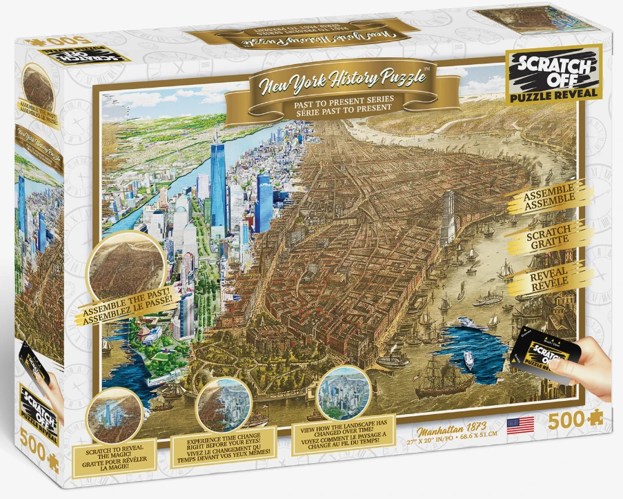 4D now introduces you Scratch-Off Puzzles, the greatest innovation to the jigsaw puzzle in over a decade! This patented puzzle is genius. You first assemble the puzzle, then you scratch the top layer to either mark, alter, or reveal a new image! See the magic as the image changes before your eyes. When complete, you can turn over the puzzle to retain the original puzzle art you assembled. This extra activity of fun brings a whole new dimension and education value!  Product measures 70cm x 50cm, consists of 500PCS and comes with a Scratch Tooland a Scratch Brush