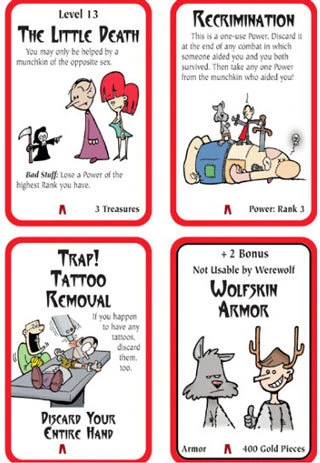 It’s got 110 shiny new… no, not shiny, dark! It’s got 110 dark and evil new cards, plus two blanks to create your own. And of course, like all other Munchkin releases, this supplement is completely compatible with the original Munchkin and all its supplements and spinoffs. Of course, since Pants Macabre has powers, it will work especially well with Super Munchkin.