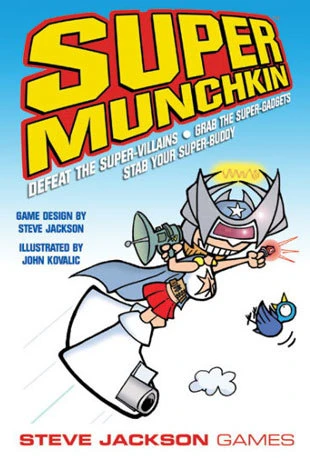 Super Munchkin is a stand-alone game, which (of course) can be combined with other Munchkin games. Designed by Steve Jackson and illustrated by John Kovalic, this one is destined to RULE THE WORLD! Mwahahaha!