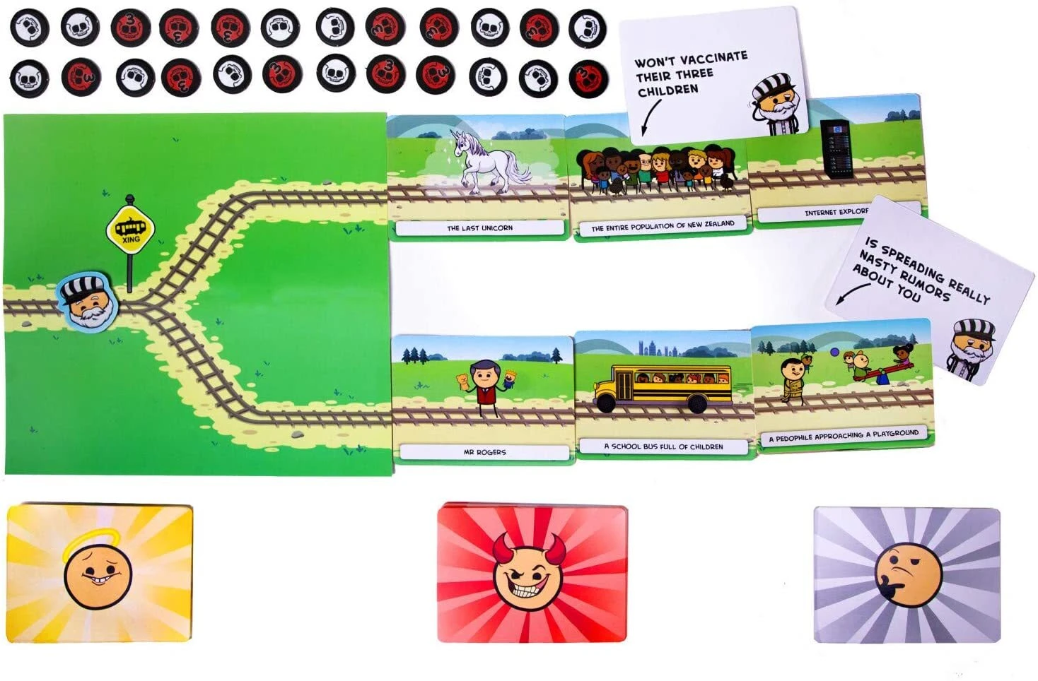 In Trial by Trolley, one player acts as the Trolley Operator and must choose where to send a murderous, out of control, trolley. Every other player at the table plays cards and argues in order to convince the operator to spare their lives and condemn everyone on the other track to a gruesome death-by-trolley.
